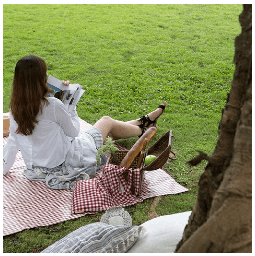 요즘은 피크닉 매트와 에코백이 세트로 나오는 것도 있는데요. 매트는 양면이 방수처리되어있어 습기에 안전하답니다.
